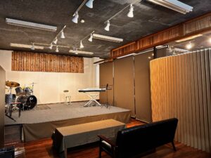 そして奥にはコンサートホールを思わせるスペースがあり、ドラムセットやキーボードなど演奏が楽しめる場所が出来ています。