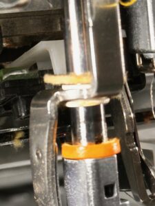 原因は、針棒クッションおよび油飛び帽子のフェルトが、3倍くらいに肥大して、針の停止位置が毎度若干ずれて、