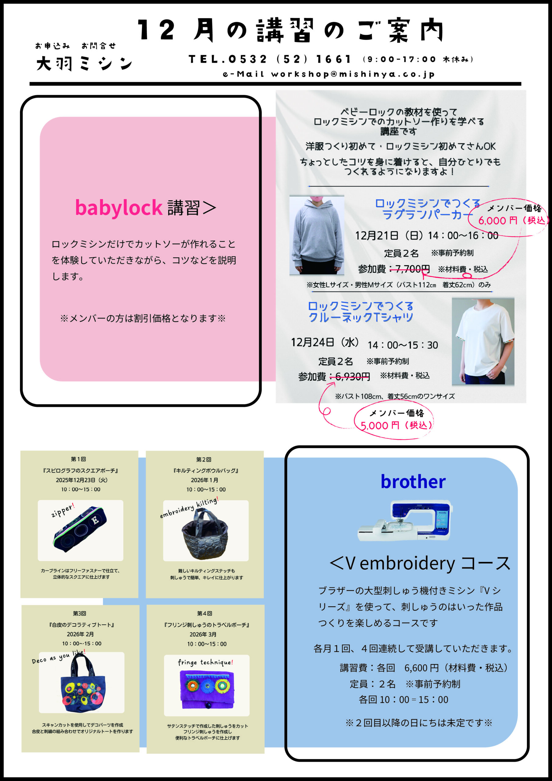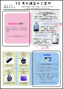 ブラザーの刺しゅう機付きコンピューターミシンVシリーズを使用し、4回の連続講習でいろんな機能を体験しながら物を作るワークショップです。