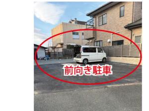店舗右側の建物の下の駐車スペース】※隣家の壁に対して前向き駐車でお願いいたします。